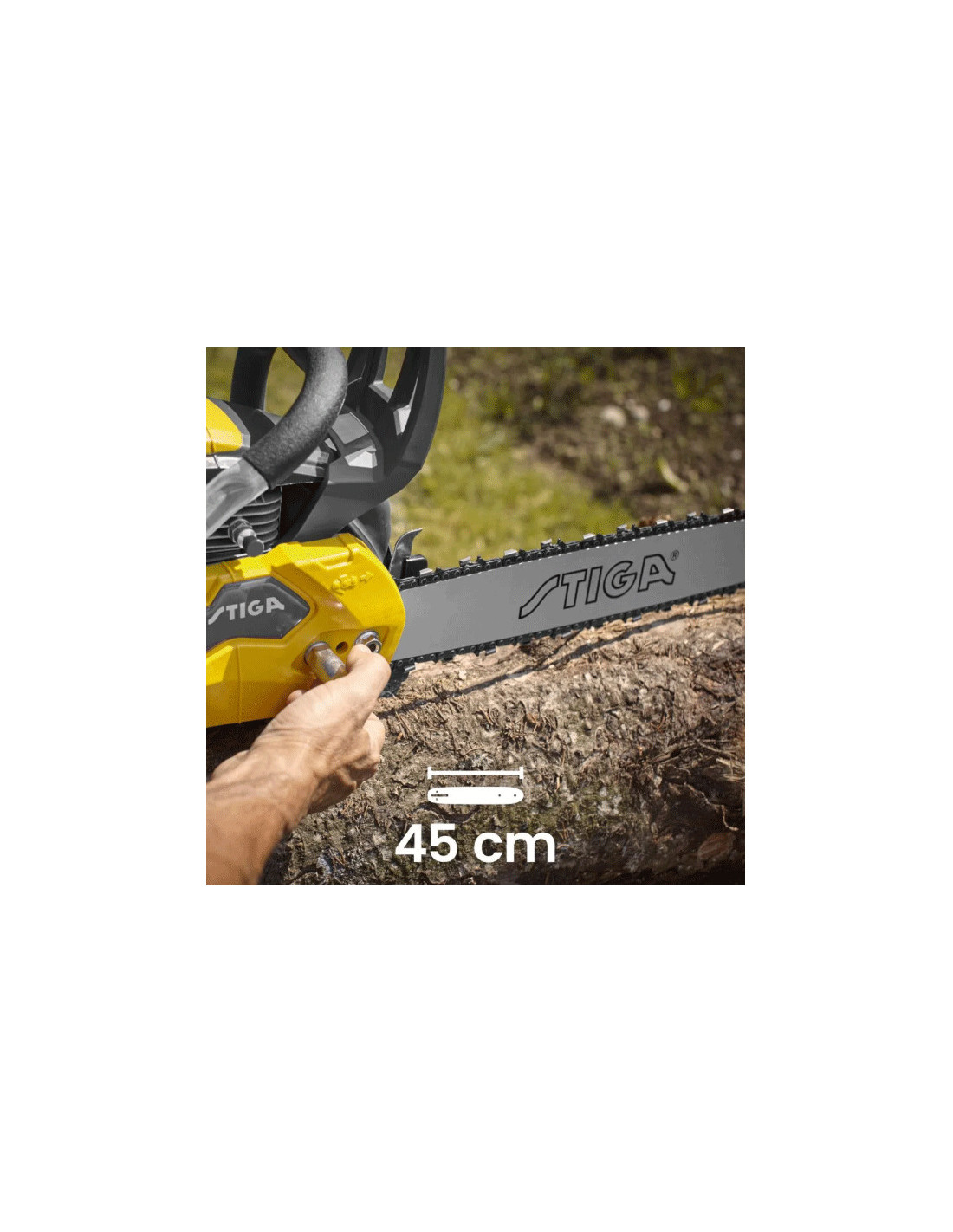 Motorsåg med en 52 cc (2,3 kW) bensinmotor och ett svärd på 45 cm (18").